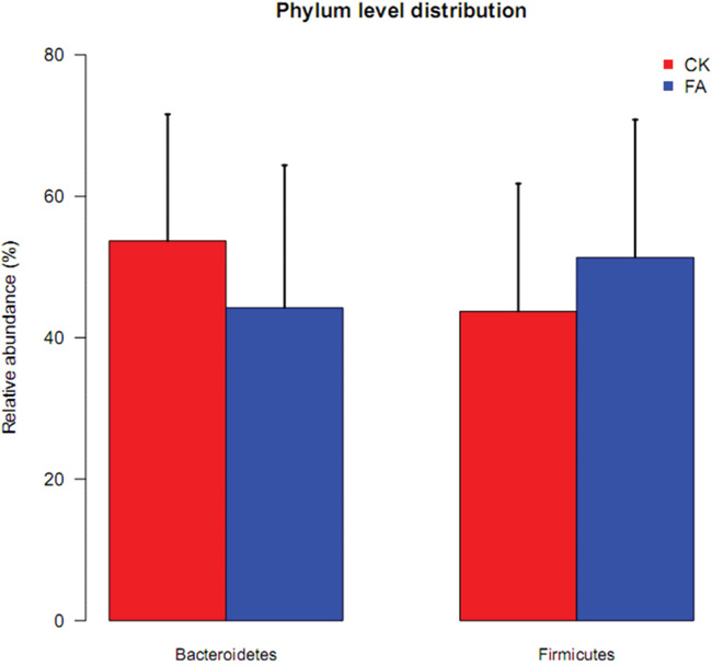 Figure 4: The relative abundance of Bacteroidetes (left) and Firmicutes (right) in CK (red) and FA (blue) groups. The relative abundance of Bacteroidetes was decreased, while the Firmicutes was increased under a FA condition. The abundance changes of the main bacterial phyla illustrated the perturbation of allergy disease on gut microbiota. Data are presented as mean ± SD.