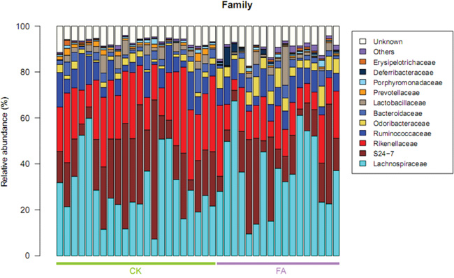Figure 5: Taxonomic distribution of bacterial families in all samples (n=22 in CK group, n=17 in FA group). The Rikenellaceae and Prevotellaceae were enriched in CK group, while the relavtive abundance of Deferribacteraceae and Lachnospiraceae was increased in FA group, demonstrating that gut microbiota is changed at family level under FA condition. Values represent the relative abundance across all samples.