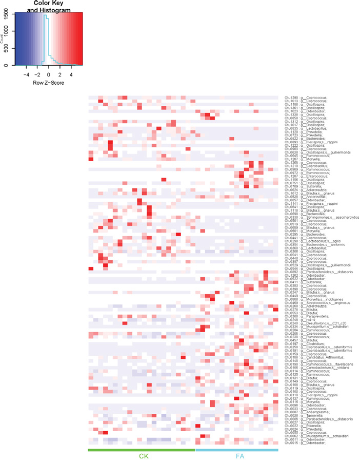 Figure 6: Heatmap demonstrating relative abundance of OTUs in all samples from the CK (n=22) and the FA (n=17) group. Columns depict individual mice. The annotation of OTU follows OTU IDs, only OTUs at genus (g_) or species (s_) level are picked out. Different OTUs were enriched in CK and FA groups respectively. The influence of FA condition on the gut microbiota was shown at bacterial species level.