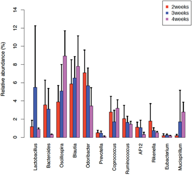 Figure 8: The change of some bacterial genera’s abundances along with time points. The barplots show the relative abundance of some bacterial genera at 3 time points, 2nd week (red), 3rd week (blue) and 4th week (purple). The relative abundance of Oscillospira and Blautia was increased along with the FA development. While the relative abundance of Bacteroides, Odoribacter, Rikenella and Ruminococcus was decreased along the 3 time points. Error bars show standard error of the mean (SEM).