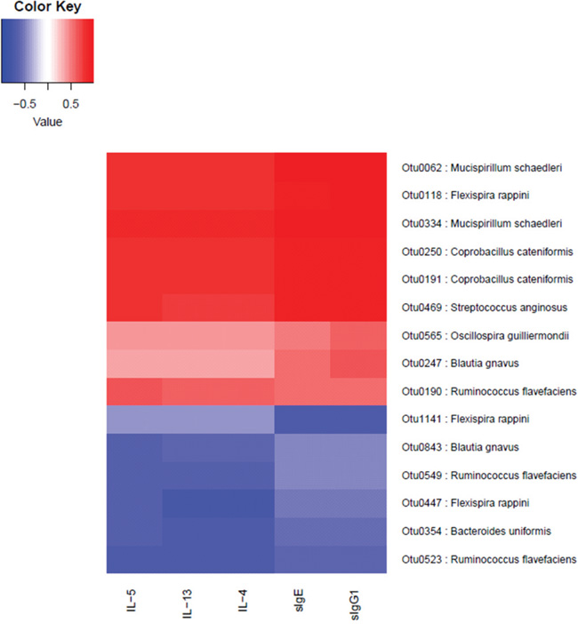 We measured five immune indices: sIgE, sIgG1, IL-4, IL-5 and IL-13. Through the association analysis of OTU and these five phenotypes. We found some OTUs are closely associated with these phenotypes (p<0.05) that were detected with the Spearman correlation coefficient (>0.8). The result showed that totally 15 OTUs could be annotated to species level and correlated with these immune indices (Supplementary Table S7).
