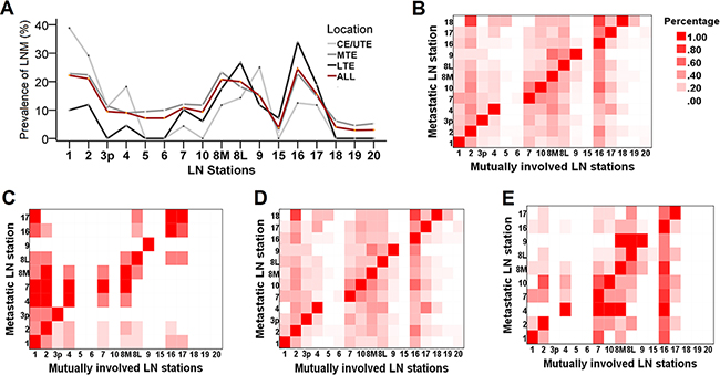 In this study, the prevalence of LNM varied depending on tumor location. According to Niwa Y, et al. [27], using similar surgical procedures, the LNM rates were close to our results when separated by tumor location. Multiple LNM were frequently observed in our study, and this phenomenon was also observed by other researchers. In the study of Hsu PK, et al. [10], the LNM at right upper mediastinum correlated with the neck, upper/middle third esophagus, and abdominal nodal groups. Tabira Y, et al. [14] also found that recurrent nerve nodal involvement was associated with cervical nodal metastasis. Moreover, the heat mapping of different tumor locations indicated that multiple LN metastases patterns may shift according to the position of the lesion. This shift was consistent with the results reported by Bin L, et al. [18]. In their research, cervical LNM was more common in patients with a tumor located in the upper part of the esophagus, and abdominal LNM was more frequent in patients with tumor situated in the lower part of the esophagus. In addition, the more obvious tendency of bidirectional metastatic patterns from MTE was also reported by Chen J, et al. [19] and Akiyama H, et al [25].
