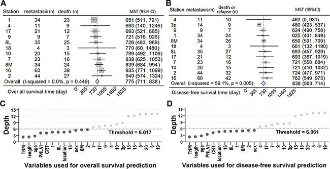 Fisher’s exact tests were performed to evaluate the differences of prevalence of LNM between tumor locations. Survival functions were estimated by the Kaplan-Meier method. Log-rank tests were performed to compare the differences of survival rates. The extent of heterogeneity of median survival time (MST) of specific nodal metastasis was evaluated with Q statistic and I2 [35]. A minimal depth algorithm [36] was used to search for the important variables associated with OS and DFS using random survival forests (RSF) [37] modular in R (random Forest SRC modular). Age, sex, location of tumor, length of tumor, pathological TNM classifications, perineural/lymphatic/vascular invasion (PNLVI), postsurgical chemoradiotherapy (CRT), and the metastasis status of 17 LN stations were included in the RSF. This model was composed of 8000 trees with additional arguments using their default criteria.