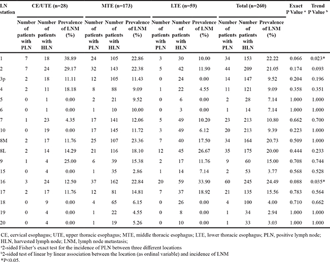 Demographic, clinical and pathological characteristics of the 260 ESCC patients enrolled during the study period are listed in Table 1. The median age of patients was 61 years. The majority of patients were male (n=201, 77.3%) and the middle thoracic esophagus (MTE) was most often involved (n=173, 66.5%). Nodal metastasis was detected in 141 patients (54.2%). Tumor stage classification (TNM) showed 51.5% (n=133) of them were stage III cases, but none with distant metastasis (all patients were M0). The median value of harvested lymph node (HLN) was 35, with lower and upper quartile 25 and 46, and the median number of positive lymph node (PLN) was 1 with interquartile range 3.