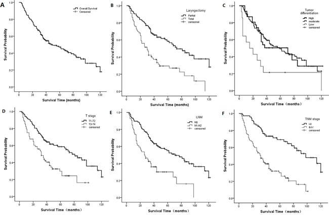 Figure 1: Kaplan-Meier curves for potential factors influencing LSCC patient survival. Overall survival A. laryngectomy (p=0.000, log-rank test) B. Tumor differentiation (p=0.008, log-rank test) C. T-stage (p=0.000, log-rank test) D. N-stage (p=0.000, log-rank test) E. TNM stage (p=0.000, log-rank test) F. Curves represent 10 years of follow-up.