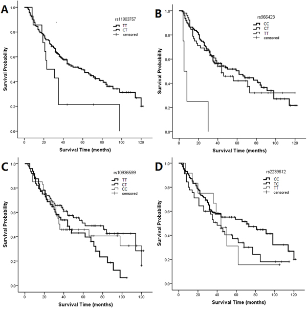 Figure 2: Kaplan-Meier curves for SNPs associated with LSCC patient survival. rs11903757 genotypes (p=0.021, log-rank test) A. rs966423 genotypes (p=0.000, log-rank test) B. rs10936599 genotypes (p=0.153, log-rank test) C. rs2239612 genotypes (p=0.192, log-rank test) D. Graphs represent 10 years of follow-up.