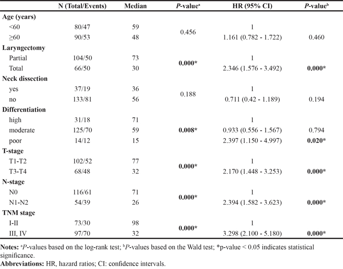 Potential factors that influenced the prognosis are shown in Table 2. We investigated relationships between these factors and survival by univariate analysis, and survival curves were drawn using the Kaplan-Meier method. We found that patient laryngectomy (p=0.000, Figure 1B), differentiation (p=0.008, Figure 1C), T-stage (p=0.000, Figure 1D), N-stage (p=0.000, Figure 1E), and TNM stage (p=0.000, Figure 1F) were associated with survival based on the log-rank test. However, survival was not correlated with age (p=0.456) and neck dissection (p=0.188) in stratified analyses. Compared with partial laryngectomy, high differentiation, T1–T2 stage, N0 stage and I–II TNM stage, the HR for total laryngectomy (95% CI, 1.576–3.492; p=0.000), poor differentiation (95% CI, 1.150–4.997; p=0.020), T3-T4 stage (95% CI, 1.448–3.253; p=0.000), N1-N2 stage (95% CI, 1.582–3.623; p=0.000) and III-IV TNM stage (95% CI, 2.100–5.180; p=0.000) increased to 2.346, 2.397, 2.170, 2.394 and 3.298, respectively.