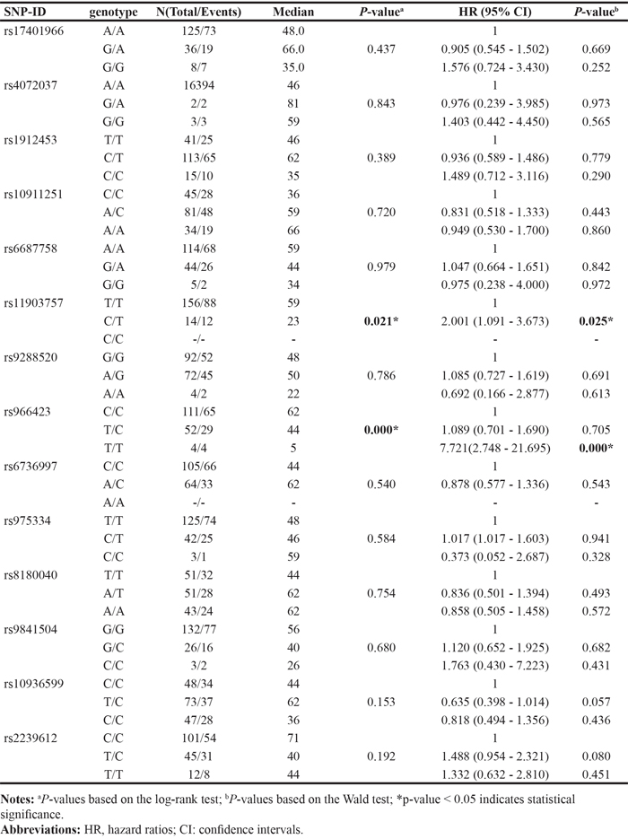 Laryngeal cancer is the second most common type of head and neck cancer. An estimated 12,000 new laryngeal cancer cases are diagnosed in the USA every year. The incidence of laryngeal cancer is much higher in men than in women, especially for those between 60 and 70 years of age [6]. All patients in the current study were men. Consistent with other studies, we found that patients with total laryngectomy, poor differentiation, T3–T4 stage, N1–N2 stage or III–IV TNM stage had reduced survival [9–12]. We developed multivariate Cox regression analysis models that adjusted for the most important covariates, including SNP, tumor differentiation, neck dissection, T stage and TNM stage. In some researches indicated that patients T-stage and N-stage had demonstrated to be significantly associated with survival and these findings are consistent with results of most other studies. Our study also obtained the consistent conclusion [9, 13, 14]. A multivariate analysis was conducted, taking the variables found to be significant in univariate analyses (p≤0.2) into account. We showed that rs11903757 and rs966423 polymorphisms correlate with LSCC patient survival. In particular, theS rs11903757 CT and rs966423 TT genotypes correlated with poorer outcomes in this patient group.