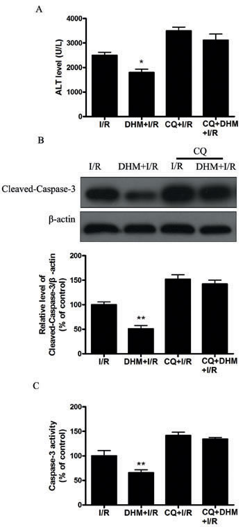 Figure 3: DHM decreases liver injury after I/R through induction of autophagy and abolished by CQ. Mice were pretreated with CQ (60 mg/kg, i.p.) 0.5 h prior to DHM treatment. A. ALT levels were determined using an ALT Determination Kit. B. Representative immunoblot of Cleaved-Caspase-3 protein levels (17 kDa) in mice liver tissue. β-actin (42 kDa) was the internal standard for protein loading. C. Caspase-3 activities in mice liver samples were determined using a Caspase-3 Activity Determination Kit. The results are expressed as a percentage of control, which was set at 100 %. The values are presented as the means± SEM, *p < 0.05, **p < 0.01 versus the liver I/R group (n = 20).