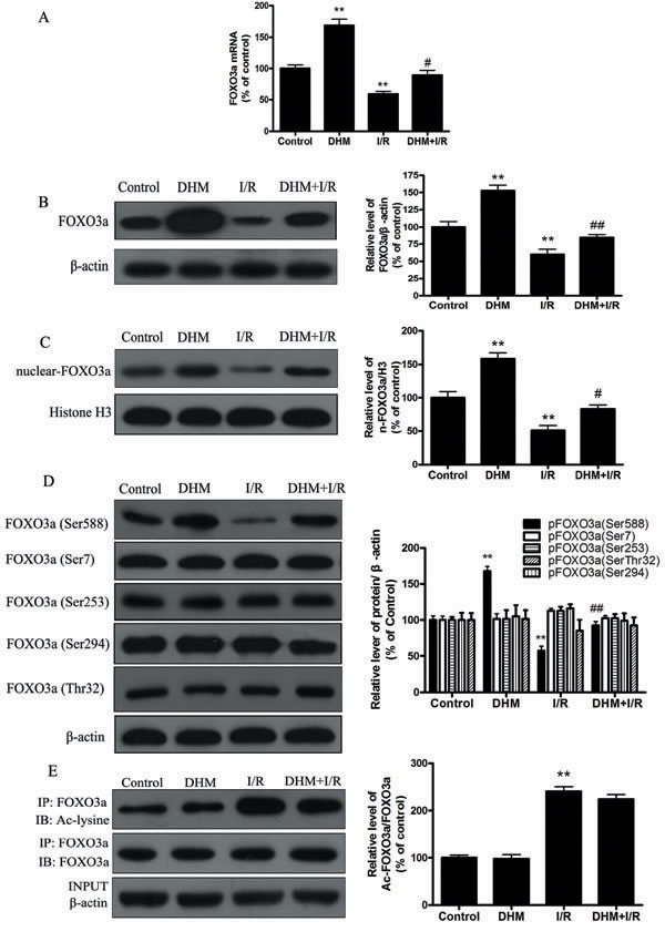 Figure 5: DHM significantly increases FOXO3a expression, and enhances FOXO3a nuclear translocation and phosphorylation modification after I/R. A. The mRNA level of FOXO3a. B. Representative immunoblot of FOXO3a protein levels, with β-actin as an internal loading control. C. Representative immunoblot of nuclear FoxO3a levels, with H3 as an internal loading control. D. p-FOXO3a(Ser588), p-FOXO3a(Ser7), p-FOXO3a(Ser294), p-FOXO3a(Ser253) and p-FOXO3a(Thr32) protein expression levels were measured using Western blot analysis as described previously, with β-actin as an internal loading control. E. Acetylation of FOXO3a by immunoprecipitation with an FOXO3a antibody, followed by immunoblot analysis of anti-acetylated-lysine. A representative Western blot and the quantification of the ratio of acetylated FOXO3a to FOXO3a are shown. The results are expressed as a percentage of the control, which was set at 100%. The values are presented as the means ± SEM, **p < 0.01 versus the control group and #p < 0.05, ##p < 0.01versus the liver I/R group (n = 20).