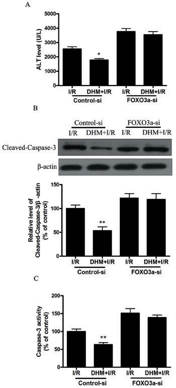 Figure 7.: FOXO3a mediates the protective effects of DHM. After RNA interference of FOXO3a in mice A. ALT levels were determined using an ALT Determination Kit. B. Representative immunoblot of Cleaved-Caspase-3 protein levels in mice liver tissue. β-actin was the internal standard for protein loading. C. Caspase-3 activities in mice liver samples were determined using a Caspase-3 Activity Determination Kit. The results are expressed as a percentage of control, which was set at 100 %. The values are presented as the means± SEM, *p < 0.05, **p < 0.01 versus the liver I/R group (n = 20).