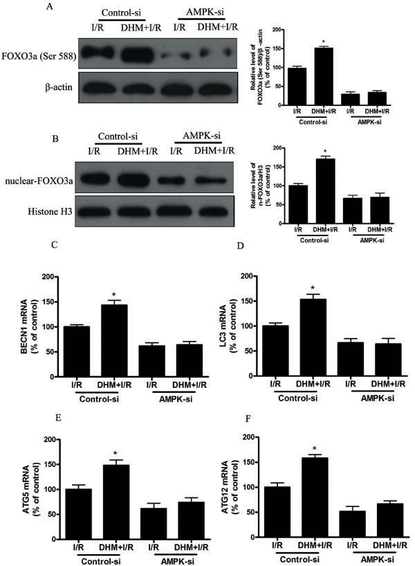 Figure 8: AMPK is involved in DHM-induced FOXO3a -dependent autophagy. Mice were pretreated with AMPK-si prior to DHM treatment. A. p-FOXO3a(Ser588), protein expression levels were measured using Western blot analysis as described previously, with β-actin as an internal loading control. B. Representative immunoblot of nuclear FOXO3a levels, with H3 as an internal loading control. The mRNA level of C. BECN1, D. LC3, E. ATG5, and F. ATG12, was determined using RT-PCR as described previously. The results are expressed as a percentage of control, which was set at 100 %. The values are presented as the means± SEM, *p < 0.05 versus the liver I/R group (n = 20).