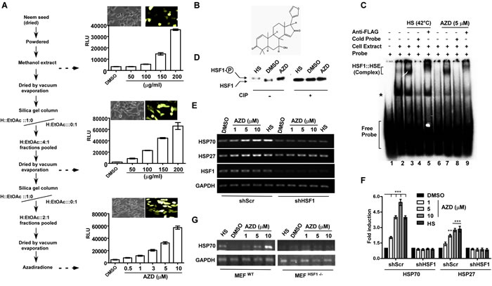 Figure 1: Azadiradione (AZD) activates HSF1 and its target heat shock chaperone genes. A. Flowchart of stepwise purification of AZD accompanied by an increase in specific activity measured by GFP expression (next to phase contrast images of cells) and luciferase assays as indicated. H, n-hexane; values are mean±SEM, n ≥ 3. B. Chemical structure of AZD. C. AZD induces DNA-binding ability of HSF1 in cells determined by EMSA using γ-32pATP-labeled HSE (~1 ng/reaction) as described in the materials and methods. Whole cell extract (WCE) (50 µg) prepared from HEK293 cells expressing FLAG-HSF1 pre-treated with AZD or DMSO or HS (at 42°C/1 h) were used as indicated. The reactions were resolved on a 4% acrylamide and bis-acrylamide (29:1) gel and autoradiographed. D. AZD treatment induces HSF1 hyperphosphorylation like HS in WCE used in (C) which was erased upon phosphatase treatment determined by immunoblot with α-FLAG antibody. E. AZD treatment induces HSP70 and HSP27 transcription by HS in HEK293 cells that is sensitive to shRNA-mediated HSF1 downregulation (shHSF1) as determined by RT-PCR assay. Representative agarose gels of PCR products obtained using equivalent amounts of cDNAs as templates prepared from transcripts isolated from cells treated as indicated. F. Densitometric quantitation of HSP70 and HSP27 bands in agarose gels as shown in panel E from three independent experiments. **p < 0.01;***p < 0.001. G. AZD activates HSP70 only in MEF cells carrying wild type HSF1 MEFWT gene but not in MEF cells that have been deleted both copies of HSF1 gene (MEFHSF1-/-). Expression of HSP70 mRNA was measured by semiquantitative RT-PCR assay. The PCR products were resolved in agarose gels visualized by ethidium bromide staining.