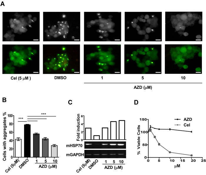 Figure 2: AZD reduces protein aggregation and associated toxicity in the cell. A. Effect on ataxin130Q-GFP aggregation by AZD, or celastrol, (Cel) or DMSO as indicated in Neuro-2a cells. Scale bar 10 µm. B. The aggregates were counted and plotted after 48 h treatment, 450 cells were counted for each treatment, ***p < 0.001. C. Ethidium bromide stained agarose gel showing relative levels of HSP70 (mHSP70) transcripts isolated from cells subjected to identical treatments in duplicate as represented in panel (A) estimated by semiquantitative RT-PCR assays. D. Comparison of sensitivity of Neuro-2a cells to AZD or celastrol after 24 h treatment estimated by MTT assay. Data are mean±SEM, n ≥ 3