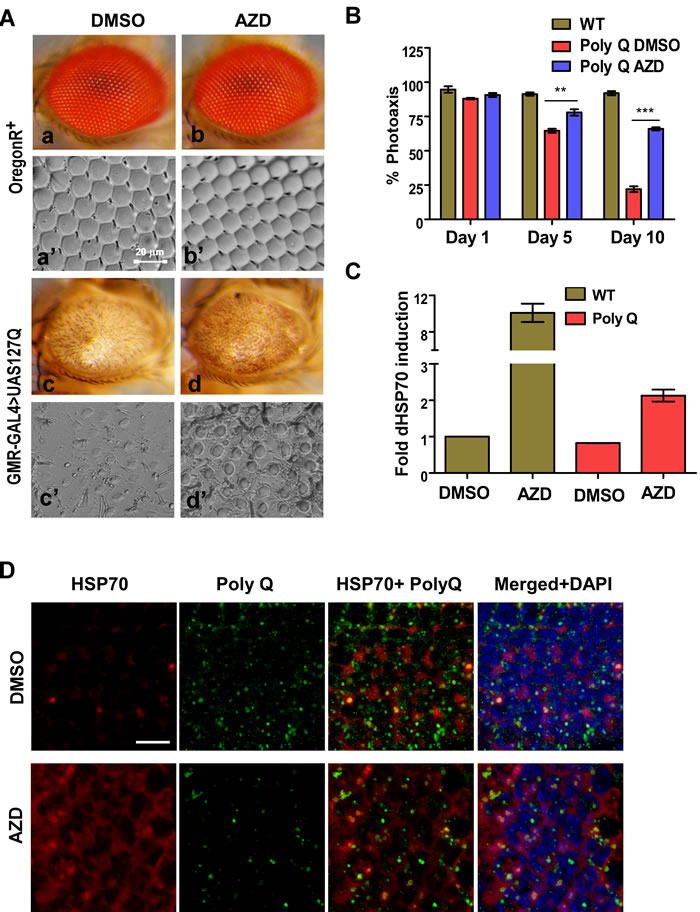 Figure 3: AZD feeding ameliorates 127Q (polyQ) induced eye defect and vision in the fruit fly. A. Dietary supplementation of AZD improved eye morphology and structure of ommatidial arrays (a-c’ vs. b-d’) damaged by polyQ expression. B. AZD supplementation significantly improved the vision defect caused by polyQ expression in the fly eyes as determined by phototaxis assay. Shown are the proportion (% on Y-axis; N = 75 flies in each case) of wild type and polyQ expressing flies (as indicated on the top) moving to the illuminated chamber on different days (X-axis; ** and *** indicate P < 0.01 and < 0.001), respectively, for comparison between DMSO and AZD treated polyQ flies. C. Dietary supplementation of AZD induces levels of HSP70 transcripts (Y-axis) in the head of the flies not expressing or expressing polyQ (X-axis). Data are mean±SEM, n ≥ 3. D. Compared to DMSO (upper row) dietary supplementation of AZD induces expression of HSP70 and reduces the level of polyQ in retinal cells as detected by immunostaining as indicated. Individual or merged staining in the confocal projection images are indicated on top of each column. Scale bar 20 micrometer.