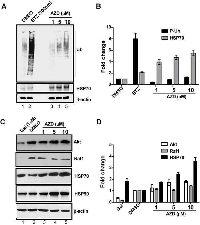Figure 4: AZD induces HSP70 protein expression without interfering with the functions of HSP90 or proteasome. WCE (20 µg) of HEK293 cells pretreated for 16 h with bortezomib (BTZ) or geldanamycin (Gel) or various concentrations of AZD, or DMSO were subjected to immunoblot A. using the antibodies against anti-ubiquitin (P-Ub). The levels of HSP70 protein in the same samples were also determined as indicated using anti-HSP70 antibody. B. The bands in the blot were estimated and plotted as bar graph considering ß-actin levels as an internal loading control. C. Immunoblot with antibodies against two HSP90 client proteins Akt or Raf1 and HSP70 and HSP90 itself to compare their relative expression levels in those samples. D. Band intensities in the blot were estimated by densitometric scanning and plotted to compare their expression levels. ß-actin levels were used as internal loading control.