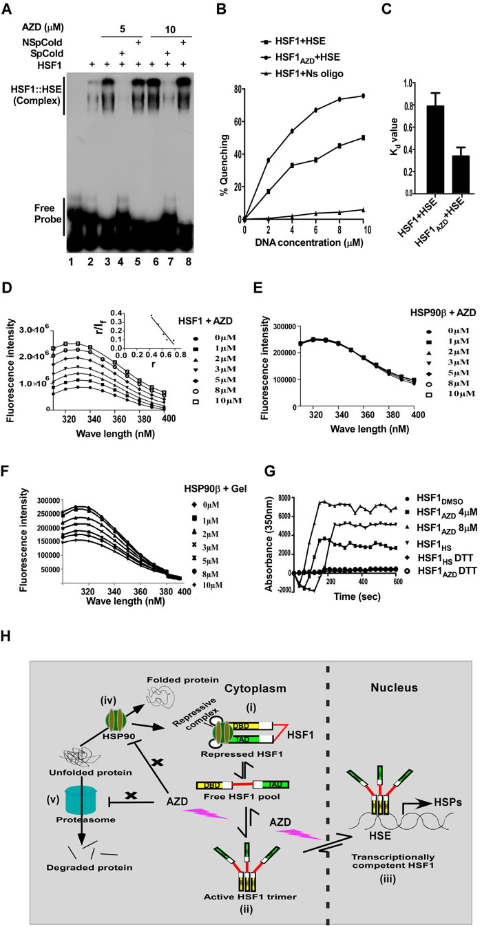 Figure 5: AZD directly interacts with the purified HSF1 protein tested by EMSA as well as fluorometric assay. A. Autoradiogram of an EMSA showing concentration-dependent enhancement of radiolabeled HSE binding of HSF1 (0.5 μM) by AZD. The binding is competed out by excess unlabeled HSE (SpCold) but not by an unrelated double-stranded (ds) DNA oligonucleotide (NSpCold) as described in the method. B. Effect of AZD (5 μM) on the binding of increasing concentration HSE by HSF1 (2 μM) measured by fluorometric assay as indicated. C. Bar diagram representing the Kd values of HSF1 binding to HSE without or with AZD. D. Concentration dependent effect of AZD as indicated on HSF1 (2 μM) fluorescence (inset: Scatchard plot of AZD binding to HSF1) and E. on HSP90 (2 µM) fluorescence. F. Effect of geldanamycin (Gel) on the indicated concentration on HSP90 fluorescence. G. Concentration dependent effect of AZD (as indicated) or heat shock (HS) on HSF1 (2 µM) multimerization in the cell-free system determined by monitoring the kinetics of polymerization by using light scattering at 350 nm. The presence of DTT in the reaction abolished the polymerization induced by AZD or HS. H. Cartoon proposing AZD targeting the free pool of monomeric HSF1, an intermediate between repressed (i) and active HSF1 (homotrimeric state) (ii) in the cell that translocates to the nucleus to execute its transcription function (iii). HSF1 is kept in inactive monomeric state by a repression complex composed of proteins including HSP90, HSP70, p23 and immunophilin (i); AZD does not disturb (indicated by a cross symbol) HSP90 chaperone function of refolding of unfolded/misfolded client proteins (iv), or proteasome that degrades irreversibly unfolded protein (v).