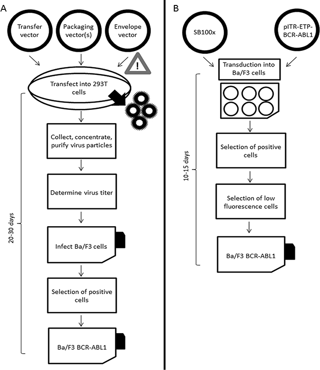 Figure 1: Workflows of lentiviral A. and Sleeping Beauty transposon-based B. transformation of Ba/F3 cells with BCR-ABL1 fusion gene constructs.