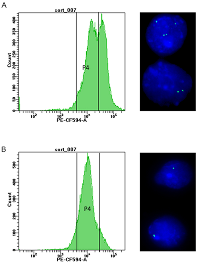 Figure 2: Flow-sorting of Ba/F3 cells. Panel A. shows the histogram before sorting, with gate P4 encompassing a low-fluorescent cell fraction for targeted enrichment. Gate P4 was set above the auto-fluorescence level of Ba/F3 cells (4 x 103 PE-CF594 -A fluorescence on the FACSAriaFusion instrument) and 2 x 104 PE-CF594. On the right, the FISH image taken before flow-sorting documents the unsorted cells with two or more insertions (630x magnification). Panel B. shows the histogram of flow-sorted cells after one week in cell culture, with the great majority of cells located within gate P4. The FISH image on the right documents selective enrichment of cells carrying single insertions of BCR-ABL1 constructs by gating for cells with appropriate fluorescence intensity.