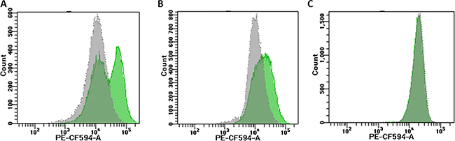 Figure 3: Different types of fluorescence distribution in unselected cells. Unselected Ba/F3 cells carrying various BCR-ABL1 constructs displayed three types of the fluorescence distribution in flow-cytometry histograms: double peak Panel A. broad peak Panel B. and slender peak Panel C. The green histograms reflect unselected cells, and the changes after appropriate flow-sorting are shown in grey.