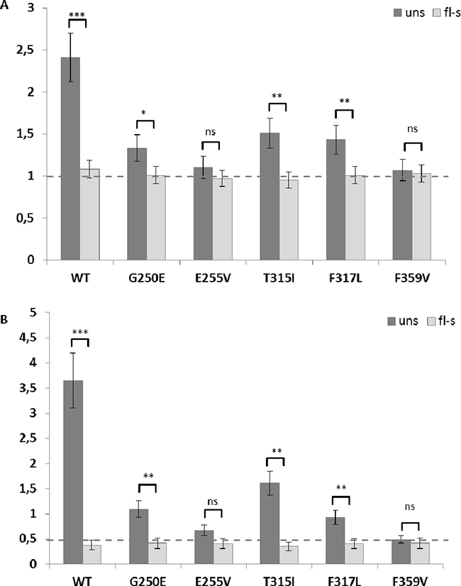 Figure 4: Real time PCR analysis of the copy number inserts and BCR-ABL1 expression analysis. Panel A. shows the copy number of BCR-ABL1 inserts in the diploid genome of Ba/F3 cells before (dark grey bars) and after (light grey bars) flow-sorting. Panel B. shows the relative expression levels of BCR-ABL1 before (dark grey bars) and after (light grey bars) sorting. The dashed horizontal line highlights the average of one BCR-ABL1 construct insertion in flow-sorted cells and the uniform BCR-ABL1 mRNA expression level in flow-sorted cells uns, unselected; fl-s, flow-sorted; ** p<0.01; *** p<0.001; **** p<0.0001.