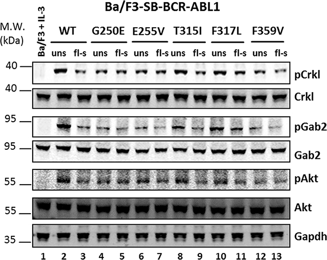 Figure 5: Western blot analysis of unselected and flow-sorted Ba/F3-BCR-ABL1 cells. Cell lysates were prepared from the parental Ba/F3 cells (growing in the presence of IL-3) (lane 1) and Ba/F3 cells bearing different BCR-ABL1 constructs before and after flow-sorting, as indicated in Figure 2. The cell lysates were probed against different antibodies targeting the proteins indicated on the right. WT, wildtype; uns, unselected cells; fl-s, flow-sorted cells.