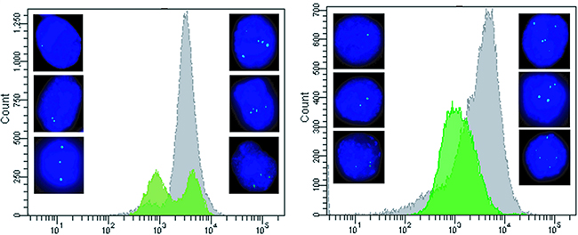 In order to assess whether cells with multiple insertions have a proliferative advantage, unselected Ba/F3 cells with BCR-ABL1T315I (Figure 6A) and BCR-ABL1F317L (Figure 6B) constructs previously shown by FISH analysis to represent a mixture of populations with one, two and more insertions were investigated. The cells were grown in culture under standard conditions to study their proliferative behavior. After four weeks in culture, the cells were subjected to FACS analysis and the histograms revealed a major shift towards higher fluorescence levels. Subsequent assessment by FISH analysis showed multiple hybridization signals in virtually all cells analyzed (Supplementary Table S4) indicating the proliferative advantage of cells with several insertions of BCR-ABL1 constructs.