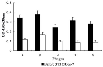 Figure 1: Specific binding of the positive phage clones to bFGF receptors. The binding affinities of 5 positive phage clones to Balb/c 3T3 cells and Cos-7 cells were detected by ELISA assay. Data presented are the mean OD values (±SDs) of triplicate samples.