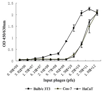 Figure 2: Comparison of binding affinity of LSPPRYP phage for different cell lines. Phages were first incubated with Balb/c 3T3, HaCat, and Cos-7 cells respectively, and then washed with PBST. The quantity of the phages binding to the cells was detected with anti-M13 mAb. Data presented are the mean OD value (±SDs) of triplicates.