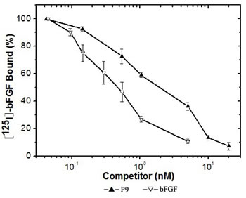 Figure 4: Specific binding of 125I -bFGF to Balb/c 3T3 cells competed by increasing concentrations of bFGF or the synthetic P9 peptides. Binding assays were performed as described in Materials and Methods. Values shown are the mean value (±SDs) of triplicates.