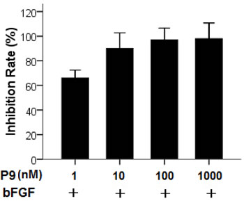 Figure 5: Inhibition of bFGF-stimulated proliferation of B16-F10 cells by the synthetic P9 peptides. Starved cells were treated with 30 ng/ml bFGF alone, or 30 ng/ml bFGF plus P9 at the indicated concentrations. Cell proliferation was determined 48 h after treatment. Data are presented as the mean (±SDs) of 3 independent experiments performed in triplicate.