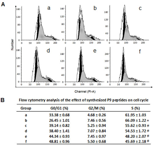 Figure 6: Flow cytometry analysis of the effect of the synthetic P9 peptides on cell cycle distribution of bFGF-stimulated cells. Panel A, (a) Control cells without treatment of bFGF or P9. (c-f) B16-F10 cells were starved for 24 h and then treated with (b) 30 ng/ml bFGF, (c) 30 ng/ml bFGF plus 1 nM P9, (d) 30 ng/ml bFGF plus 10 nM P9, (e) 30 ng/ml bFGF plus 100 nM P9, or (f) 30 ng/ml bFGF plus 1000 nM P9 for 48 h. Cells were then fixed in 70% ice-cold ethanol, washed with PBS, stained with PI, and subjected to flow cytometry analysis. Data shown are the representative pictures of 3 independent experiments. Panel B, cell cycle distribution of the control and treated cells. Data are presented as the mean (±SDs) of 3 independent experiments. * P< 0.01 vs control group; # P< 0.01 vs bFGF group.