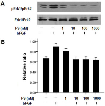 Figure 7: Synthetic P9 peptides inhibit bFGF-induced MAP kinase activation. Panel A. Before stimulation with 30 ng/ml bFGF for 20 min, starved B16-F10 cells were pretreated with P9 at the indicated concentrations for 5 min. Cell lysates were resolved with 10% SDS-PAGE, transferred to PVDF membrane, and blotted with anti-pErk1/pErk2 mAb. Data shown are the representative pictures of 3 independent experiments. Panel B. Density ratios of pErk1/pErk2 to Erk1/Erk2. Data are presented as the mean (±SDs) of 3 independent experiments.