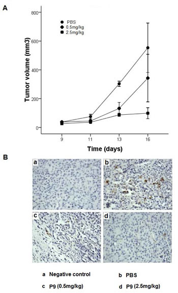 Figure 8: Synthetic P9 peptides inhibit the growth of the murine melanoma B16-F10 cells in mice. (A) B16-F10 cells were injected subcutaneously into female C57BL/6 mice. When tumors were visible on all mice on day 7, treated mice were intraperitoneally injected with P9 on alternate days at 0.5, or 2.5 mg/kg, whereas control mice were injected with PBS (n=10 mice for each group). (B) P9 inhibits Erk1/Erk2 activation in tumors in vivo. On the next day after last injection, the B16-F10 tumors were extracted, fixed, and embedded in paraffin. Tissue sections were immunostaining for phospho-Erk1/2 as described in the Material and Methods. Meanwhile, negative control was incubated with PBS instead of monoclonal anti-phospho-Erk1/2. Negative control (Panel a), PBS (Panel b), 0.5 mg/kg (Panel c), and 2.5 mg/kg (Panel d). Data are representative of 2 independent experiments.