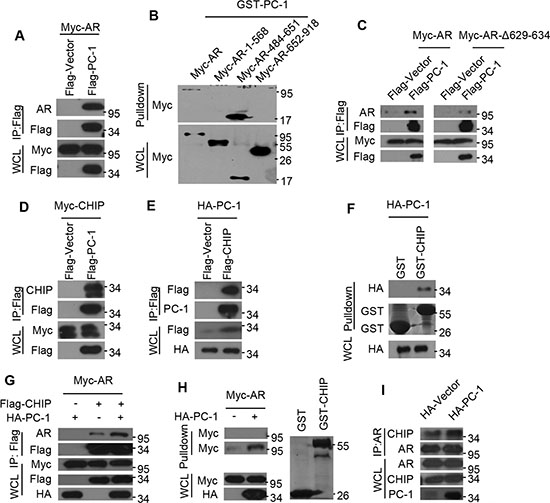 Figure 2: PC-1 enhances AR and E3 ligase CHIP interactions. (A) Myc-AR was expressed in HEK293 cells either alone or together with Flag-PC-1. Lysates were immunoprecipitated with anti-FLAG antibody and immunoblotted with the indicated antibodies for Western blotting. (B) Myc-AR and AR deletion mutants were constructed and expressed in HEK293 cells independently. Lysates were incubated with purified GST-PC-1 for 4–6 h, separated by PAGE and immunoblotted with anti-Myc antibody for Western blotting. (C) HEK293 cells were cotransfected with Flag-PC-1 or vector either with Myc-AR or its mutants ARΔ629-634. Lysates were immunoprecipitated with anti-FLAG antibody and immunoblotted with the indicated antibodies for Western blotting. (D) Myc-CHIP and Flag-PC-1 or (E) HA-PC-1 and Flag-CHIP were expressed in HEK293 cells either independently or jointly. Lysates were immunoprecipitated with anti-FLAG antibody and immunoblotted with the indicated antibodies for Western blotting. (F) HA-PC-1 were expressed in HEK293 cells and lysates were pulled-down with GST-CHIP or GST protein and immunoblotted with anti-HA antibody for Western blotting. (G) Myc-AR was expressed in HEK293 cells either with HA-PC-1 or Flag-CHIP alone or with both together. Lysates were immunoprecipitated with anti-FLAG antibody and immunoblotted with the indicated antibodies for Western blotting. (H) Myc-AR and HA-PC-1 were expressed in HEK293 cells either independently or jointly. Lysates were incubated with purified GST or GST-CHIP for 4-6 h, separated by PAGE and immunoblotted with anti-Myc antibody for Western blotting. Left: upper panel is the purified GST incubated with lysates and lower is the purified GST-CHIP incubated with lysates; Right: Gel was Coomassie Blue-stained to show relative loading of recombinant GST and GST-CHIP. (I) Lysates of LNCaP cells and PC-1 overexpressing LNCaP-PC-1 cells were immunoprecipitated with anti-AR antibody and immunoblotted with the indicated antibodies for Western blotting.
