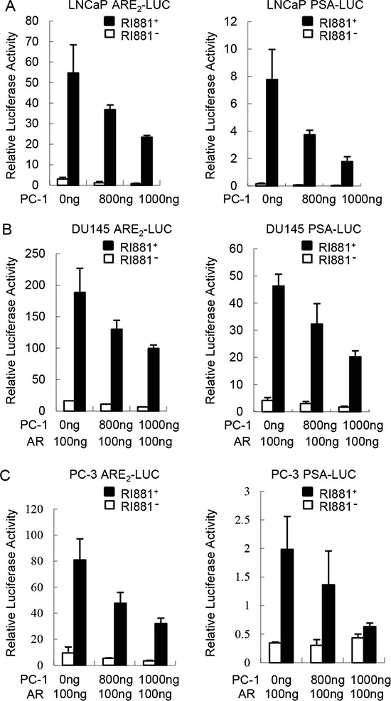 Figure 5: PC-1 inhibits AR transcriptional activity. (A) LNCaP cells were transiently cotransfected with 300 ng ARR2-Luciferase or PSA6.1-Luciferase reporter plasmids with 800 ng or 1000 ng pcDNA3.1-hPC-1 plasmids and 25 ng of pRL-TK Renilla reporter. After transfection 36 h, the medium was replaced with steroid-free medium in the presence or absence of 1 nM R1881 for 12 h. The lysates were harvested 48 h after transfection and the luciferase activity was measured using commercially available kits from Promega. (B) DU145 and (C) PC-3 cells were transiently transfected with AR and other expression plasmids as indicated. The luciferase activity was measured and normalized as described in panel A. Data shown represent three independent experiments.