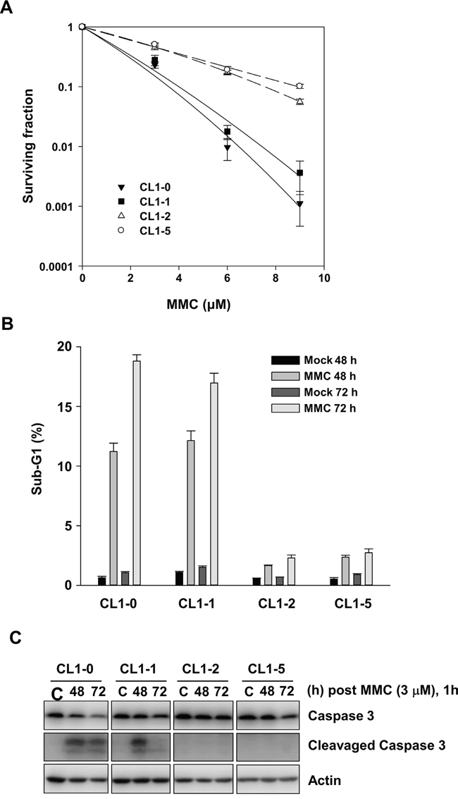 Figure 1: The effects of MMC on CL1-0, CL1-1, CL1-2, and CL1-5 cells. A. Colony numbers of CL1-0, CL1-1, CL1-2, and CL1-5 cells at the indicated concentration of MMC treatment (n = 3). B. The percent of sub-G1 was measured by propidium iodide staining and flow cytometry following 1 h treatment with 3 μM MMC in CL1-0, CL1-1, CL1-2, and CL1-5 cells (n = 3). C. Immunoblot analysis of full-length and cleaved caspase 3 products in CL1-0, CL1-1, CL1-2, and CL1-5 cells at 48 or 72 h after 3 μM MMC treatment. C: control, cells without MMC treatment. Loading control: actin.