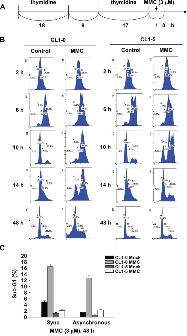 Figure 2: Cell cycle distribution of synchronized CL1-0 and CL1-5 cells post 3 μM MMC treatment. A. Time scale of double thymidine block and MMC treatment. B. Cell cycle distribution of CL1-0 and CL1-5 cells at the indicated time points post MMC (3 μM) treatment in synchronized cells. C. Sub-G1 analysis following 1 h treatment with 3 μM MMC in synchronous or asynchronous CL1-0 and CL1-5 cells (n = 3).