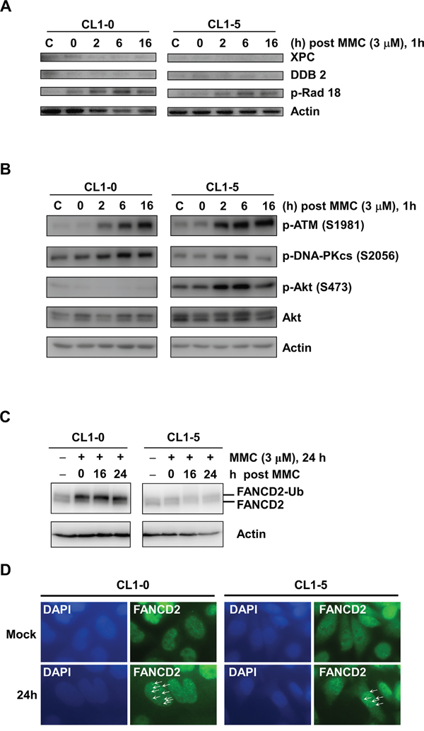 Figure 3: Western blot analysis of DNA damage responses in Cl1-0 and CL1-5 cells post 3 μM MMC treatment. A. Immunoblot analysis of XPC, DDB2, and p-Rad18 (S403) in CL1-0 and CL1-5 cells at the indicated time points post 3 μM MMC treatment. C: control, cells without MMC treatment. Loading control: actin. B. Immunoblot analysis of p-ATM (S1981), p-DNA-PKcs (S2056), p-Akt (S473), and Akt in CL1-0 and CL1-5 cells at different time points post 3 μM MMC treatment. C: control, cells without MMC treatment. Loading control: actin. C. Immunoblot analysis of FANCD2 in CL1-0 and CL1-5 cells at the indicated time points post 3 μM MMC treatment.FANCD2-Ub: ubiquitinated FANCD2. Loading control: actin. D. Representative images of CL1-0 or CL1-5 cells with or without 3 μM MMC treatment for FANCD2 nuclear foci. Arrows: FANCD2 foci. Green: anti-FANCD2 antibody. Blue: DAPI.