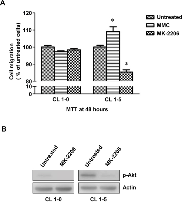 Figure 5: The migration of CL1-0 and CL1-5 cells without p-Akt after MMC treatment. A. The cell migration of CL1-0 and CL1-5 cells that were untreated, treated with MMC, or treated with MK-2206. *P < 0.05, n = 3. B. Immunoblot analysis for confirming the decrease in p-Akt by MK-2206 treatment in CL1-0 and CL1-5 cells. Loading control: actin. All values are represented as mean +/- SEM.