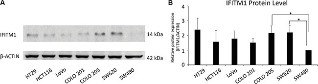 Figure 1: Evaluation of IFITM1 expression in various colorectal carcinoma cell lines by western blot. (A) IFITM1 expression was evaluated in colorectal cancer cell lines. Cell lysates were obtained from the indicated cancer cell lines, and immunoblots were performed to evaluate the expression of IFITM1. ACTIN was used as the loading control. (B) Proteins were quantified by Image J and expressed as the ratio of IFITM1 to ACTIN (n = 3, *p < 0.05).