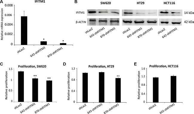 Figure 2: IFITM1 depletion modestly impairs cell proliferation in colorectal cancer cell lines. Colorectal cancer cell lines were infected with either control (shLacZ) virus or IFITM1 knockdown virus (642-shIFITM1 and 870-shIFITM1) and selected with puromycin. RNA and proteins were isolated to determine the expression of IFITM1. (A) RT-qPCR was performed to determine IFITM1 mRNA expression in SW620 cells after infection. (*p < 0.05). (B) Immunoblot with anti-IFITM1 antibody was conducted to analyze IFITM1 protein level, and ACTIN was used as the loading control. (C–E) Control (shLacZ) or IFITM1-depleted (shIFITM1) colorectal cancer cell lines were incubated for 72 hrs to determine the proliferation rate by MTT assay. Data shown are from two to three experiments (*p < 0.05, **p < 0.001).