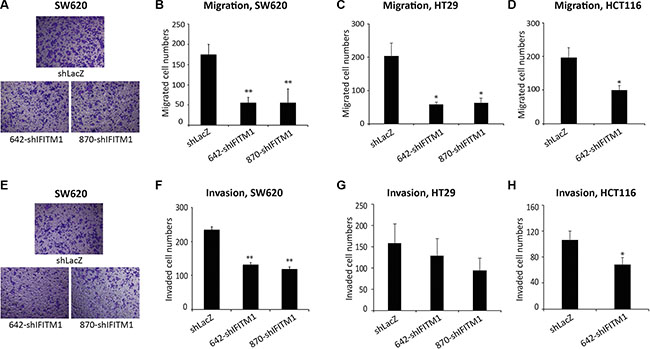 Figure 3: IFITM1 depletion impairs migration and invasion of colorectal cancer cell lines in vitro. Control (shLacZ) or IFITM1-depleted (shIFITM1) colorectal cancer cell lines were seeded in a matrigel-uncoated and coated transwell, followed by incubation for 18 hrs and 24 hrs for assessing migration and invasion, respectively. Cells that had migrated to the lower surface of the transwell were stained and quantified. (A and E) Imaging was done using an inverted microscope (magnification: 100×) and representative images are shown. Data shown (A–D: migration; E–H: invasion) are from three experiments (*p < 0.05, **p < 0.001).