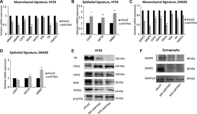 Figure 4: IFITM1 is required for the maintenance of EMT signature. (A–D) RNA was isolated from control (shLacZ) or IFITM1-depleted (shIFITM1) cancer cell lines (A and B: HT29; C and D: SW620) and EMT signature genes were determined by RT-qPCR (*p < 0.05, **p < 0.001). (E) Cell lysates were obtained from control (shLacZ) or IFITM1-depleted (shIFITM1) HT29 cells and immunoblots were conducted with antibodies indicated. ACTIN was used as a loading control. (F) Supernatants obtained from control (shLacZ) or IFITM1-depleted (shIFITM1) HT29 cells were analyzed for enzymatic activity of MMP1/3, MMP2 and MMP9.