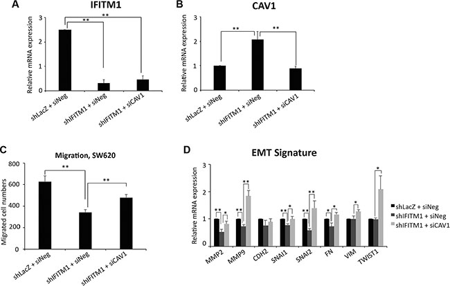 Figure 5: IFITM1 mediates EMT signature through Caveolin-1. Control (shLacZ) or IFITM1-depleted (shIFITM1) SW620 cells were treated with either control siRNA or siCAV1 for 2 days and RT-qPCR was conducted to measure the mRNA expression of IFITM1 (A) Caveolin-1 (B) and EMT signature (D) (*p < 0.05, **p < 0.001). (C) Control (shLacZ) or IFITM1-depleted (shIFITM1) SW620 cells were treated with either control siRNA or siCAV1 and then analyzed for migration ability (C). Data shown are from three experiments (**p < 0.001 ).