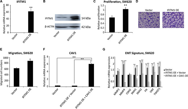Figure 6: Ectopic expression of IFITM1 promotes the proliferation and migration of SW620 cancer cells in vitro. (A and B) SW620 cells were transiently transfected with either control (vector) or IFITM1 expression construct (IFITM1 OE). RNA and proteins were isolated to examine the expression of IFITM1. (A) RT-qPCR was performed to determine IFITM1 mRNA expression in SW620 cells after transfection (**p < 0.001). (B) IFITM1 protein level was analyzed by immunoblot using anti-IFITM1 antibody, and ACTIN was used as the loading control. (C) SW620 cells transfected with control (vector) or IFITM1-expression construct (IFITM1 OE) were incubated for 72 hrs to determine the proliferation by MTT assay. Data shown are from three experiments (**p < 0.001). (D and E) SW620 cells transfected with control (vector) or IFITM1-expression construct (IFITM1 OE) were seeded in a transwell for assessing migration. Cells were incubated for 18 hrs, stained, and quantified. (D) Representative images are shown. (E) Data shown are from three experiments (*p < 0.05). (F and G) SW620 cells were transiently transfected with either Vector alone, IFITM1-overexpressing (IFITM1 OE) and Vector, or IFITM1 OE and CAV1-overexpressing (CAV1 OE) constructs. RNA was isolated from the transduced cells, and CAV1 (F) and EMT signature (G) were quantified by RT-qPCR (*p < 0.05, **p < 0.001).
