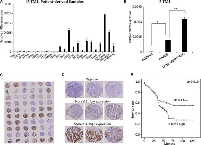 Figure 7: IFITM1 expression is associated with poor prognosis of colorectal cancer patients. (A and B) RNA was isolated from formalin-fixed and paraffin-embedded (FFPE) tissues and IFITM1 was quantified by RT-qPCR. (N: normal; T: tumor; META: metastasis samples). Individual samples (A) and average of each group of samples (B) are shown (*p < 0.05, **p < 0.001). (C–E) 232 colorectal cancer samples were stained with IFITM1 antibody and graded based on both staining intensity and staining frequency. (C and D) Representative images of tissue microarray and immunohistochemistry are shown. (E) Survival rate was determined based on the expression of IFITM1 expression using Kaplan-Meier method (p < 0.05 ).