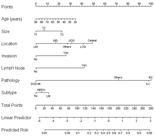 In many risk predictions of cancer, the nomogram is considered an effective tool for quantitative assessment of risk factors to maximize the accuracy of prediction. It can reflect the contribution of predictive variables to the outcome visually and directly [33, 34]. In this study, we successfully established a nomogram model for prediction of breast cancer ALN metastasis that is suitable for Chinese people. Our results showed that the histopathological type played a crucial role in ALN metastasis, followed by tumor location, clinical lymph node status, age at diagnosis, invasion of the chest wall and skin, tumor size, and molecular subtype. Applying this model for patients in the training cohort and the validation cohort in this study, the performance of the nomogram in these two groups was similar (AUC = 0.7157 versus 0.7007), and the nomogram showed good predictive value in both. These results confirmed that our nomogram was useful in different population.
