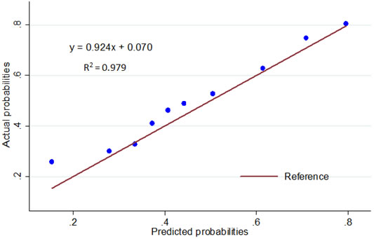 Figure 6: Calibration plot for the predictive model: The actual probability versus the predicted probability. The reference line represents perfect equality of the predicted probability and the actual incidence of ALN metastasis.