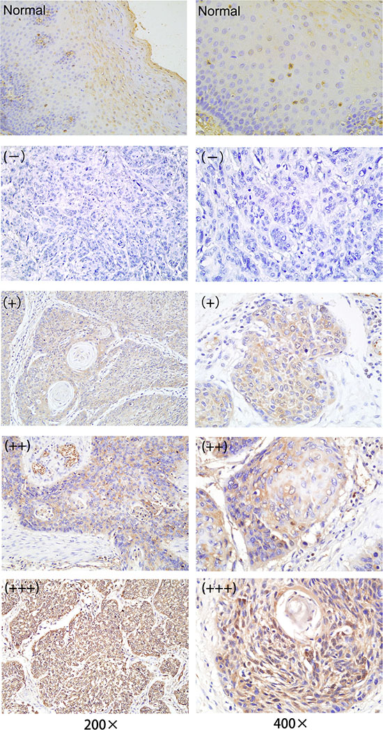 Five ×400 fields were randomly selected, and 2 pathologists independently performed the evaluation. Scores were determined by the intensity of the dye color and the quantity of positive cells. The intensity of the dye color was classified as weak, moderate, and intense (denoted by 1, 2, and 3, respectively). Grading of the number of positive cells was based on the following: 0 (< 5%), 1 (5%–25%), 2 (25%–50%), 3 (51%–75%), and 4(> 75%). The percentage of positive cells and the staining intensity of each sample were multiplied to obtain the weighted scores. The 2 grades were added, and the sections were assigned to one of the following levels: 0–1 score (–), 2–4 scores (+), 5–8 scores (++), and 9–12 scores (+++). The overexpressed value was denoted by (+++).